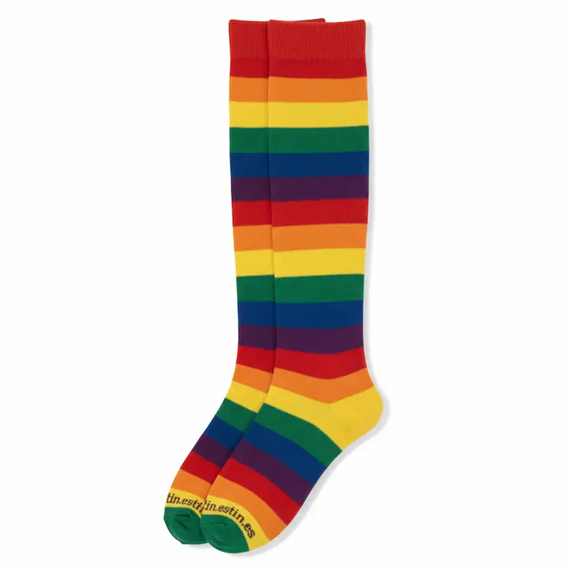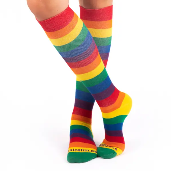 Färgglada kompressionsstrumpor med regnbågsränder som kombinerar stil och funktion. Perfekta för långa arbetsdagar där du står eller går mycket – ger lätt stöd och håller benen piggare.