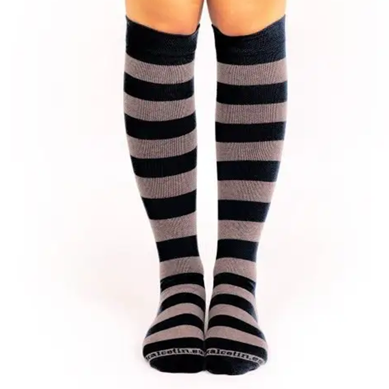 Stilrena kompressionsstrumpor i grått och svart med breda ränder – perfekt balans mellan diskret design och något mer än helsvart. För dig som vill ha ett elegant uttryck men ändå sticka ut lite, samtidigt som du får komfort hela dagen.