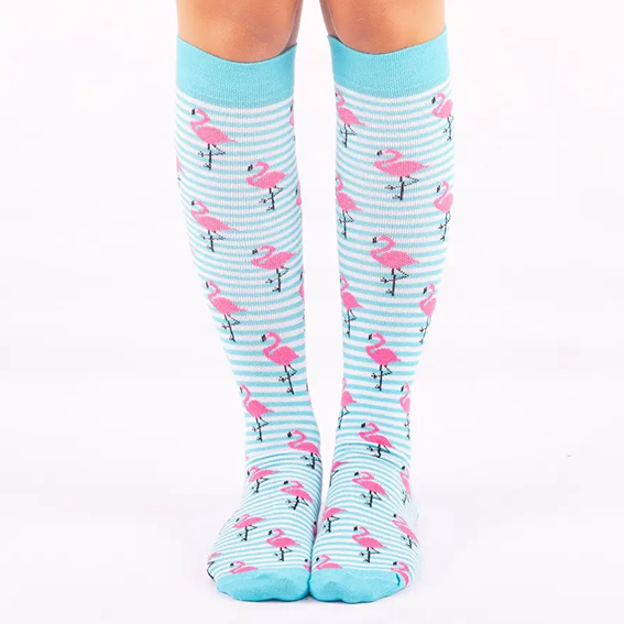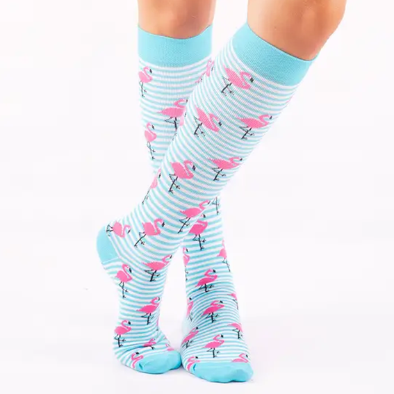 Lekfulla kompressionsstrumpor med rosa flamingos på turkos och ljusblå randig bakgrund. Perfekta för dig som vill kombinera färg och personlighet med komfort och piggare ben efter en lång dag.