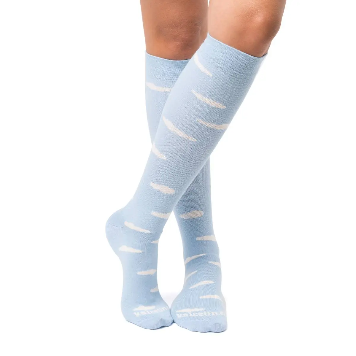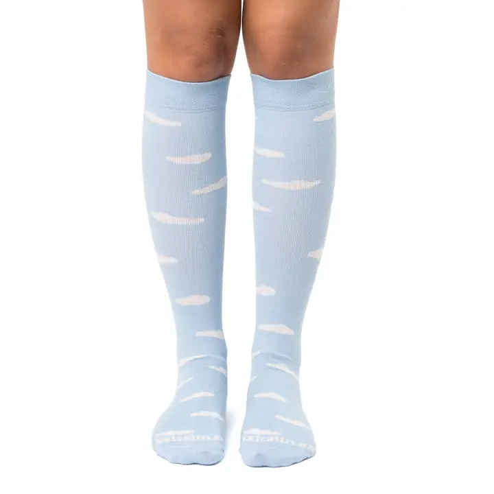 Lätta och stilrena kompressionsstrumpor med molnmönster på ljusblå bakgrund. Perfekta för en avslappnad look samtidigt som du håller benen pigga och bekväma hela dagen.