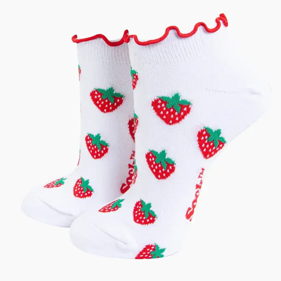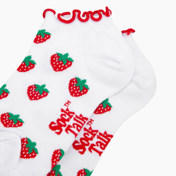 Söta och feminina låga strumpor i vitt med jordgubbsmönster och dekorativ volangkant. Perfekta för dig som vill addera en lekfull och mjuk detalj till din outfit.