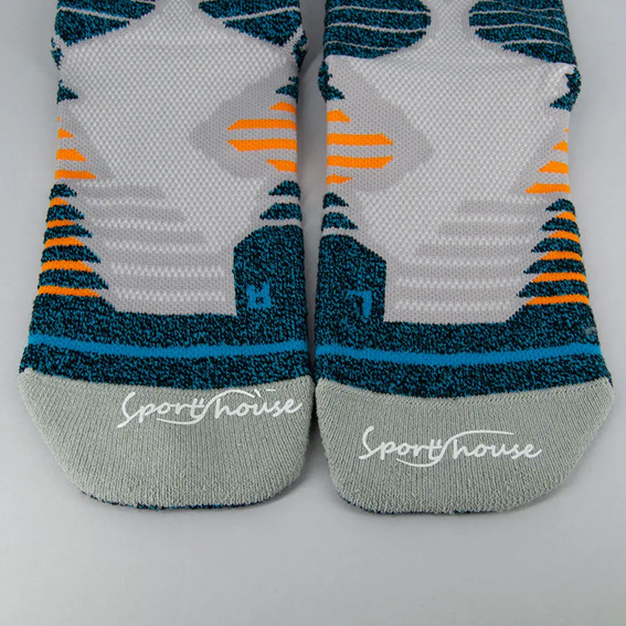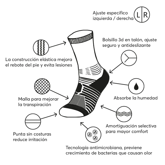 Den specifika vänster- och högerpassformen gör att varje socka är anpassad för respektive fot. Detta ger bättre stöd och komfort. Den sömlösa tådelen minskar risken för skav, blåsor och irritation, medan den 3D-formade hälen hjälper strumpan att sitta bättre på foten.